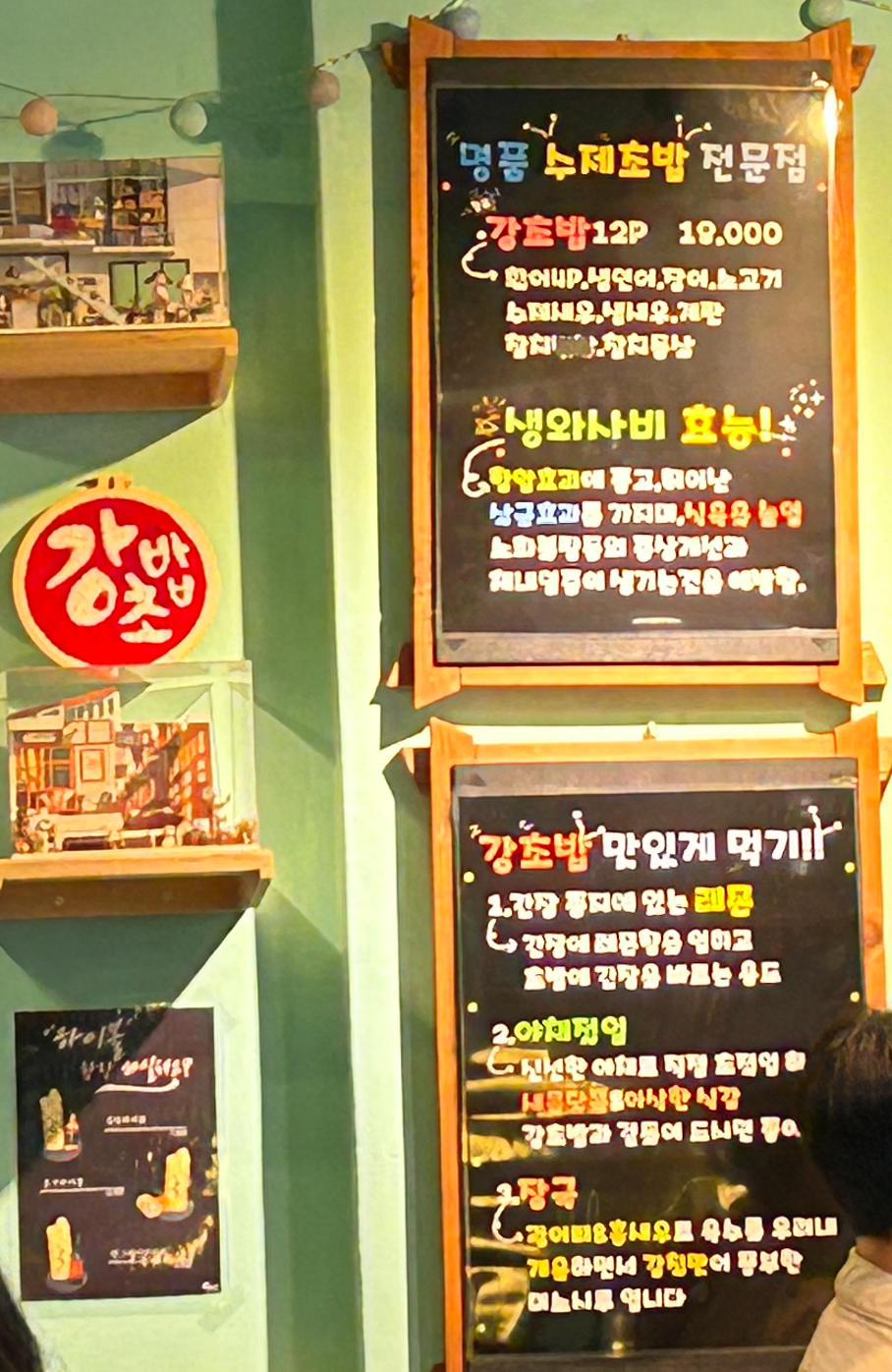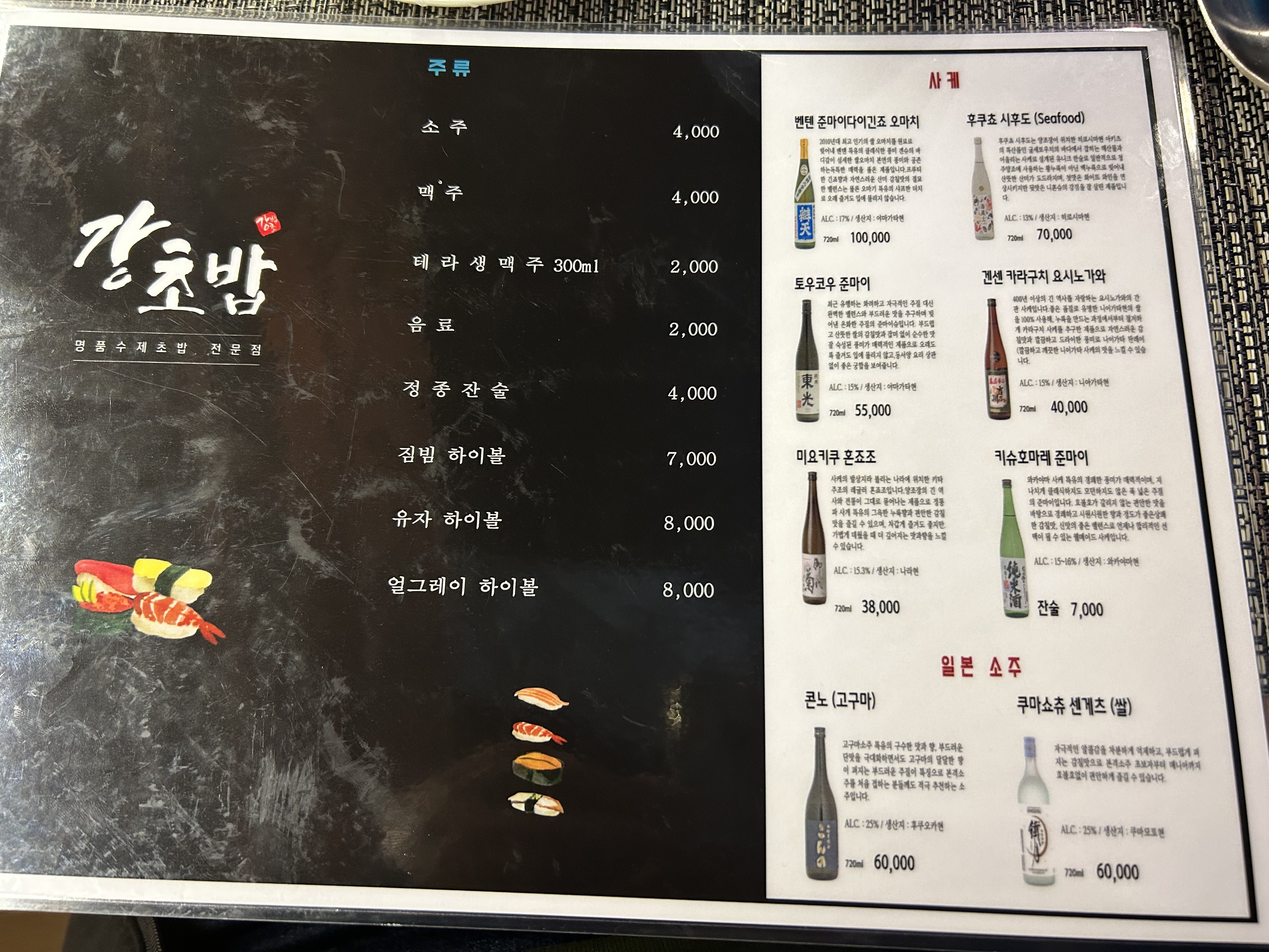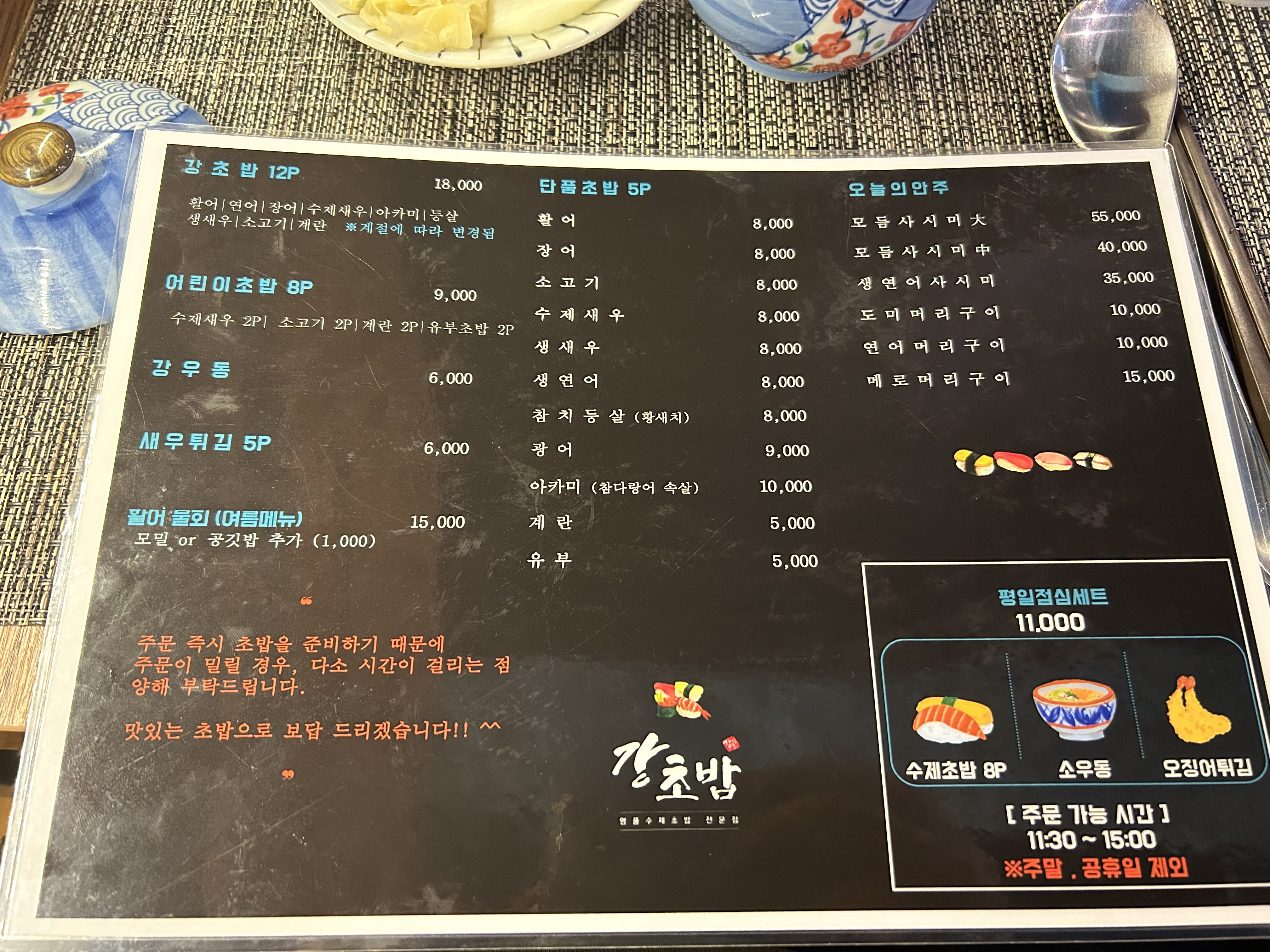주로 강초밥에 강우동에 단품하나 시켜서 먹습니다.