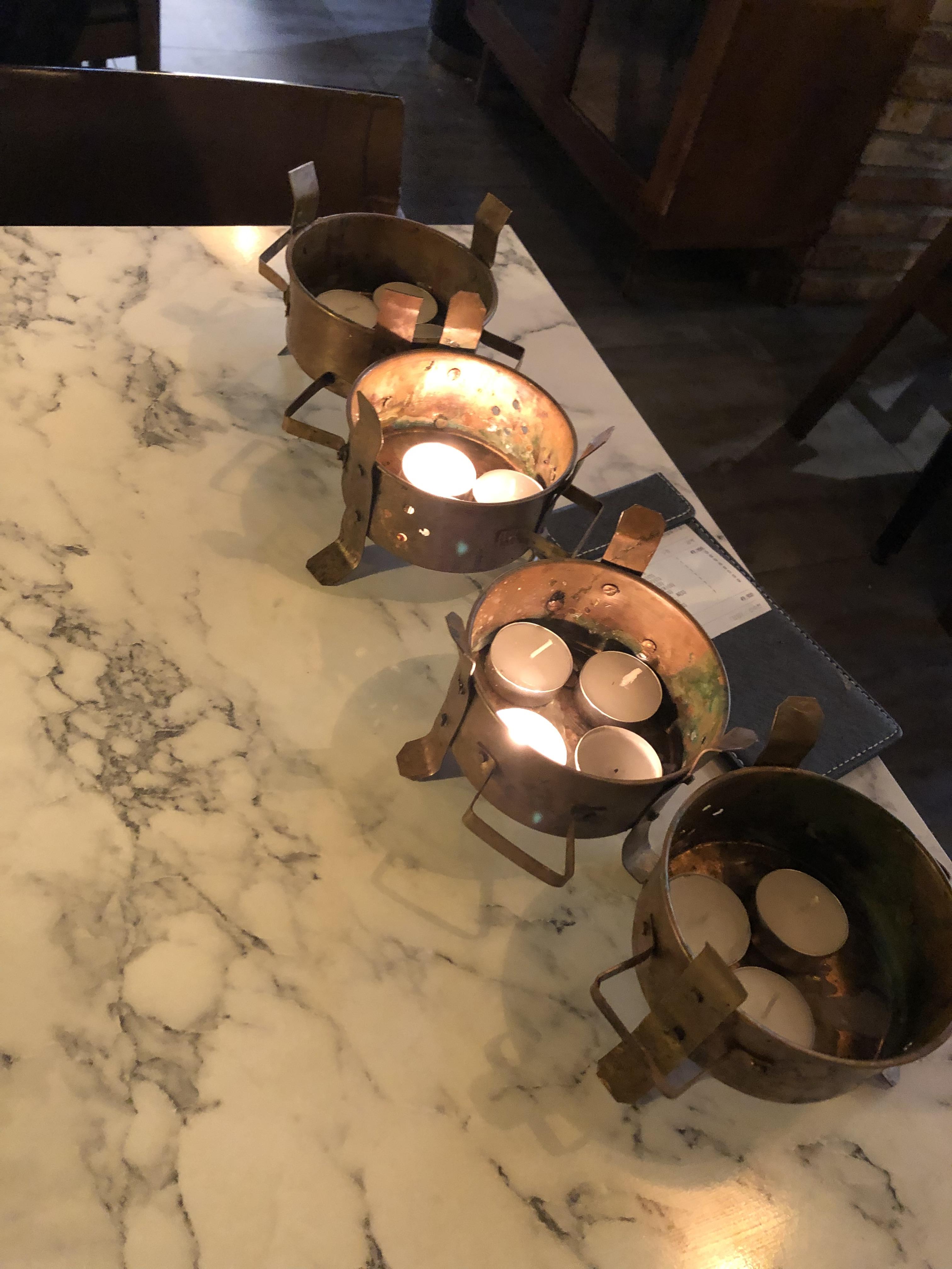 플라스틱에 대리석 무늬를 넣은 식탁, 화로는 내가 안써도 네개는 테이블에 스탠바이중